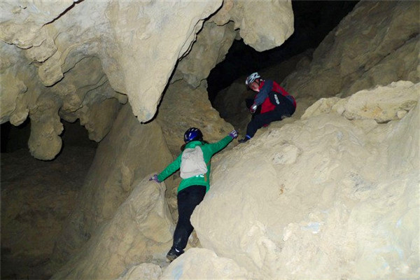 寒毛洞内小洞接大洞,大洞套小洞,洞洞相连,溶岩石或倒悬,或突兀,或横切,曲折幽奇,摸攀盘旋。